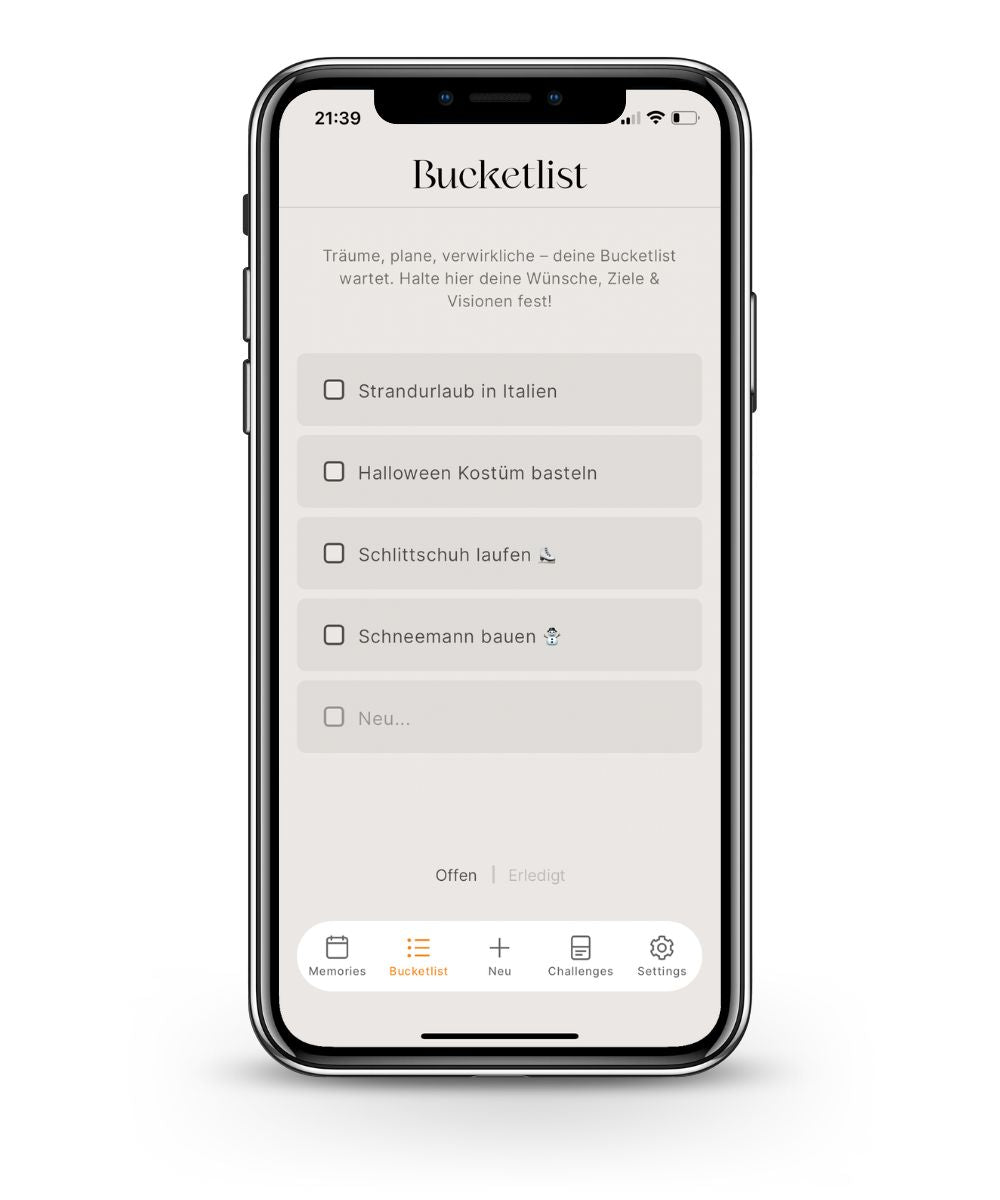 - In der App: freischalten, abhaken, auf die Bucket List setzen.